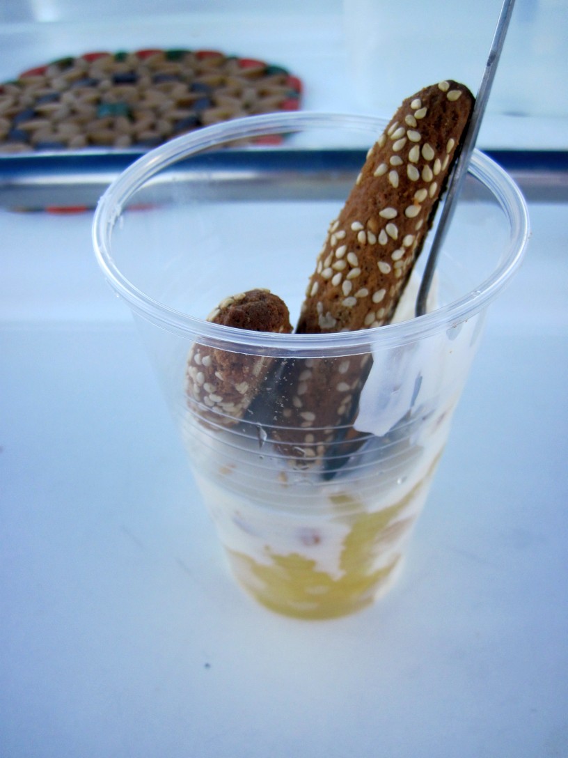 Dessert fin de croisière ... une boite de fruit au sirop, un yaourt grec et un spéculos ...