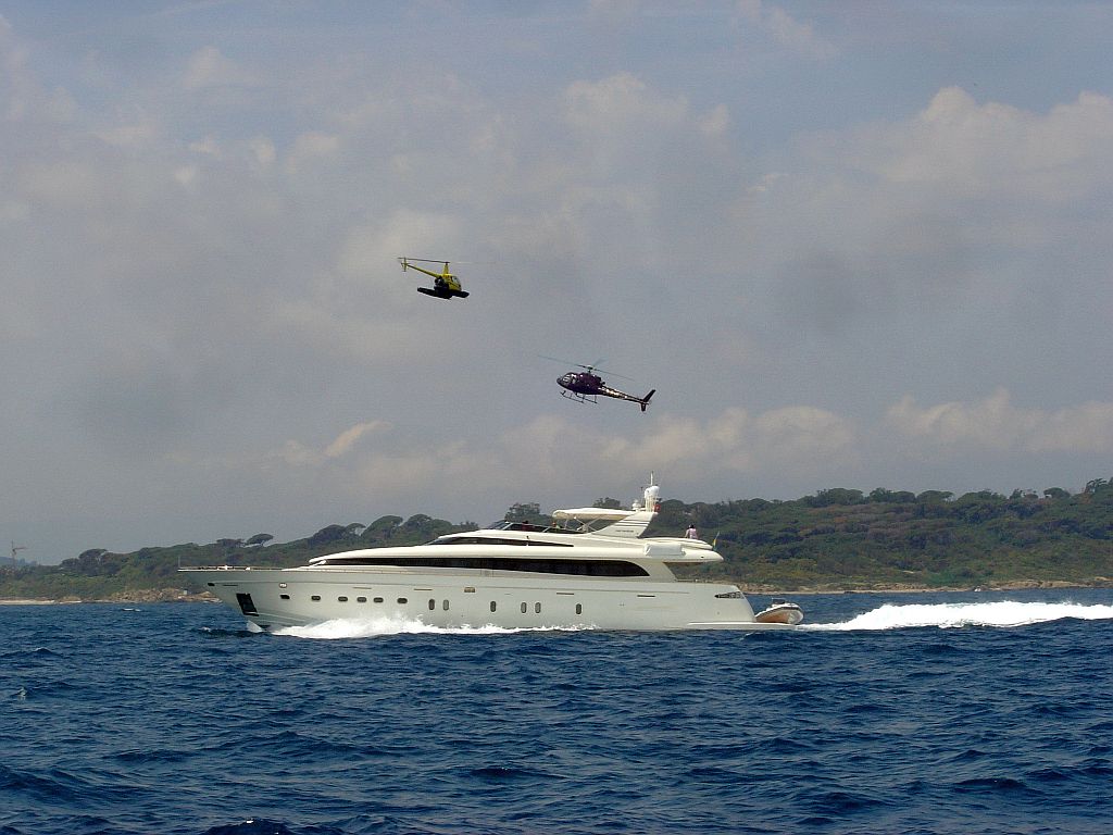 Au Large de Saint Tropez, grosse vedette chassé par 2 hélicoptères de paparazzi.