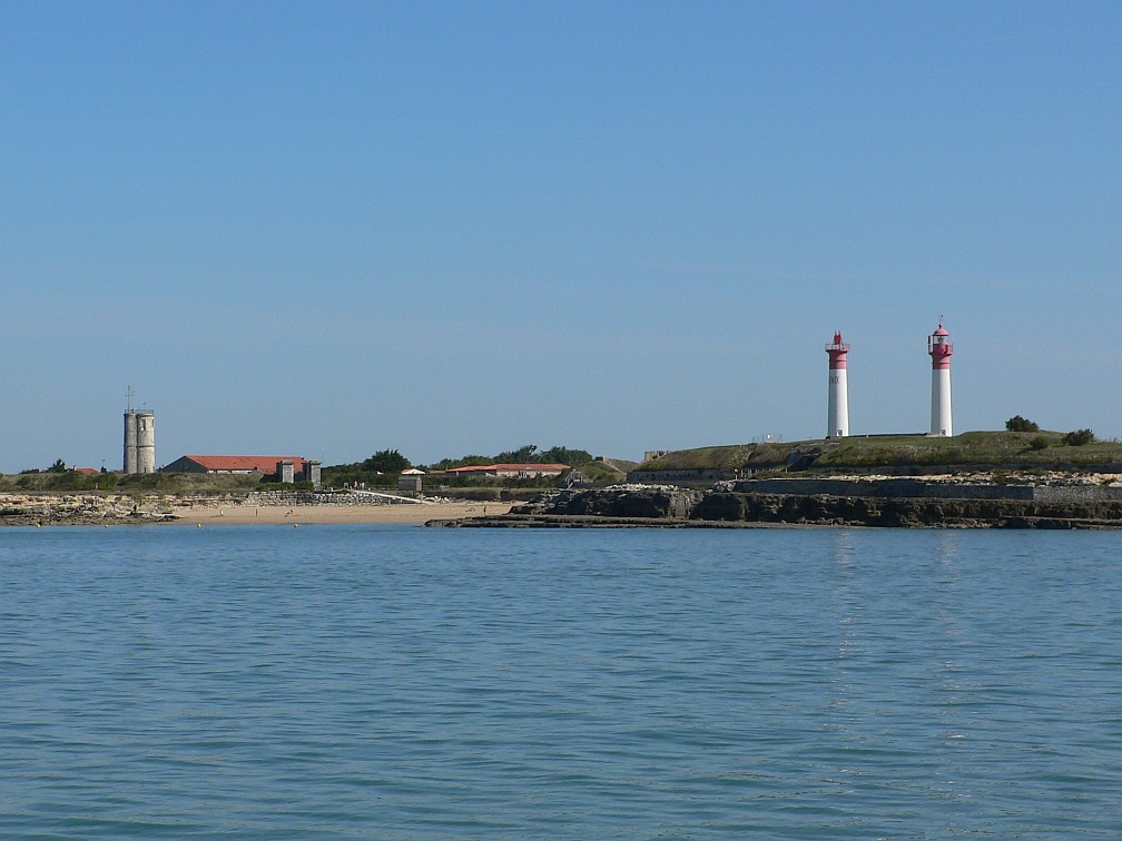 Le Phare de l'île d'Aix et sa tour écran. Au premier plan, Fort dela Rade, au niveau de la pointe Sainte Catherine.